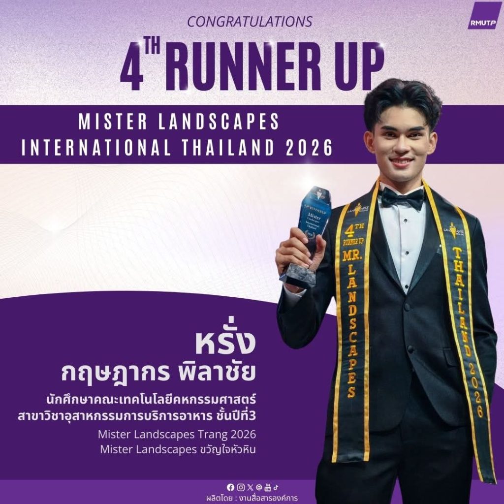 สาขาวิชาอุตสาหกรรมการบริการอาหาร ขอแสดงความยินดีกับ นายกฤษฎากร พิลาชัย นักศึกษาชั้นปีที่ 3 สาขาวิชาอุตสาหกรรมการบริการอาหาร คณะเทคโนโลยีคหกรรมศาสตร์ Mister Landscapes TRANG 2026